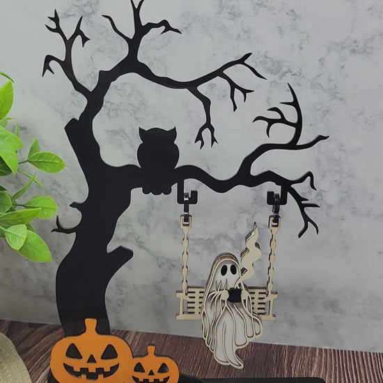 - Ghost on swing, eerie tree with owl, and pumpkins