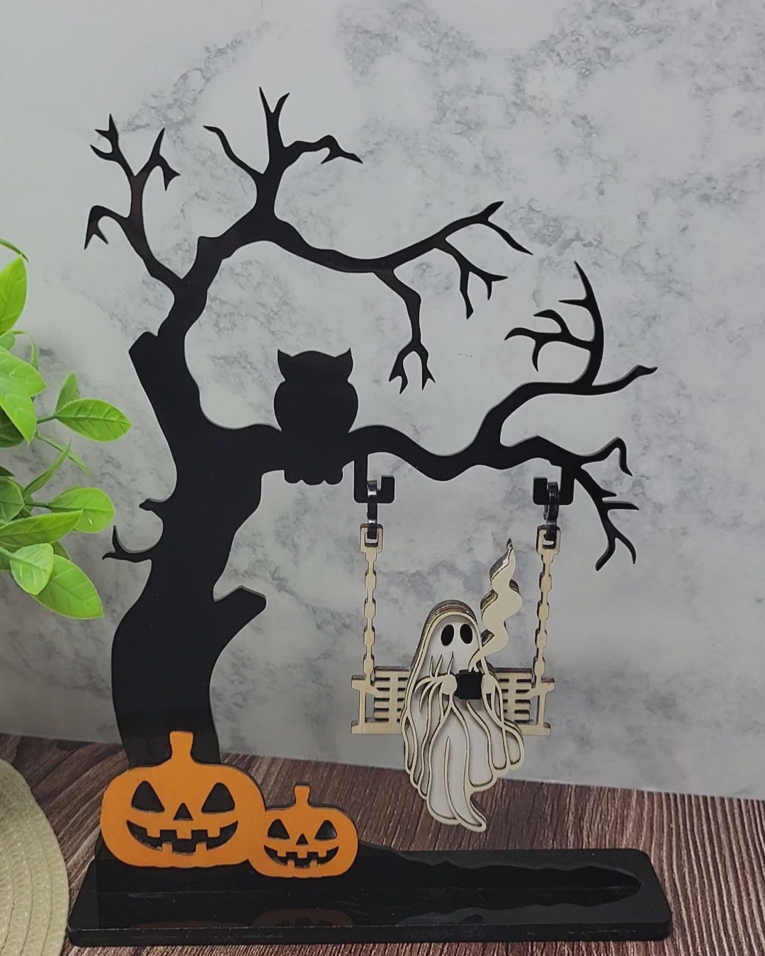 Make your Halloween display stand out with this Ghost Swing Decor, a trending piece that’s capturing attention this spooky season. Crafted from a mix of wood and acrylic, it showcases a ghost on a swing hanging from a creepy tree, complete with jack-o’-lanterns at the base and an owl perched among the branches.